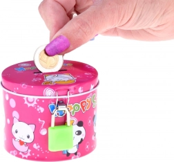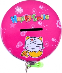 Różowa metalowa powierzchnia z wesołymi motywami zwierzątek i napisem Happy Smile przyciąga uwagę dzieci i wspiera pozytywne nawyki w gospodarowaniu pieniędzmi.