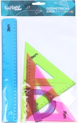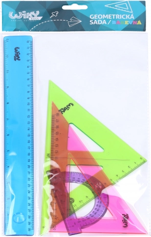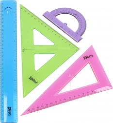 Praktyczny szkolny zestaw geometryczny do codziennego rysowania i nauki. Zawiera linijkę 30 cm, mały kątomierz oraz dwa trójkąty w czytelnym, kolorowym wykonaniu dla łatwej orientacji.