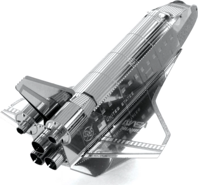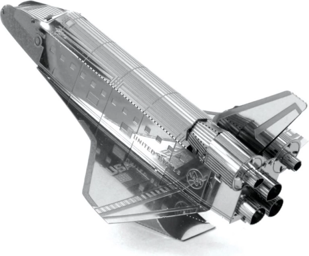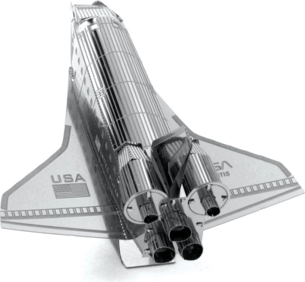 METAL EARTH Prom kosmiczny Atlantis to precyzyjny, laserowo wycinany 3D metalowy model. Z kwadratowej stalowej blaszki o wymiarach 11 × 11 cm złożysz wierną replikę legendarnego orbitera NASA z delikatnym rytem, dyszami i napisami „United States” oraz „USA”. Zmontowany model świetnie sprawdzi się jako kolekcjonerski egzemplarz i oryginalny prezent.