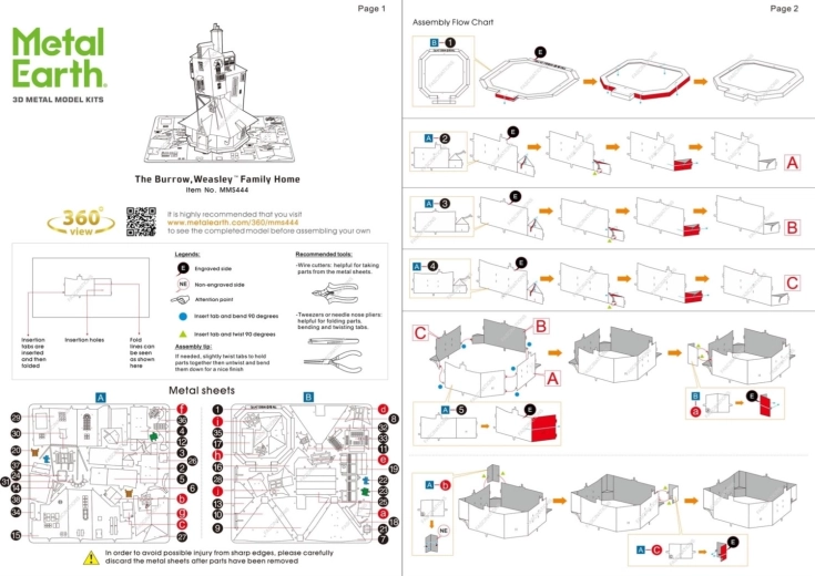 Poszczególne elementy wyjmij z metalowych arkuszy; w razie potrzeby użyj małych cążek tnących (brak w zestawie). Części łączy się za pomocą zamków tworzonych przez zaczep (dzióbek) i otwór. Zaczep zegnij przy pomocy małych, cienkich szczypiec (brak w zestawie) i stopniowo połącz wszystkie zamki, aż powstanie bardzo realistyczne dzieło!