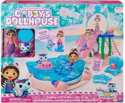 Zanurz się w świecie GABBY’S DOLLHOUSE z tematycznym zestawem basenowym, który przynosi magiczną wodną zabawę. Załóż GABBY syreni ogon, wspinaj się po drabince na zjeżdżalnię i aktywuj zmianę koloru ogonów ciepłą wodą za pomocą uroczej ośmiorniczki–spryskiwacza. Odkryj tajny portret siostrzyczki Syrenkotki w ogromnej muszli i rozpakuj Kocią Paczkę z ukrytą niespodzianką.