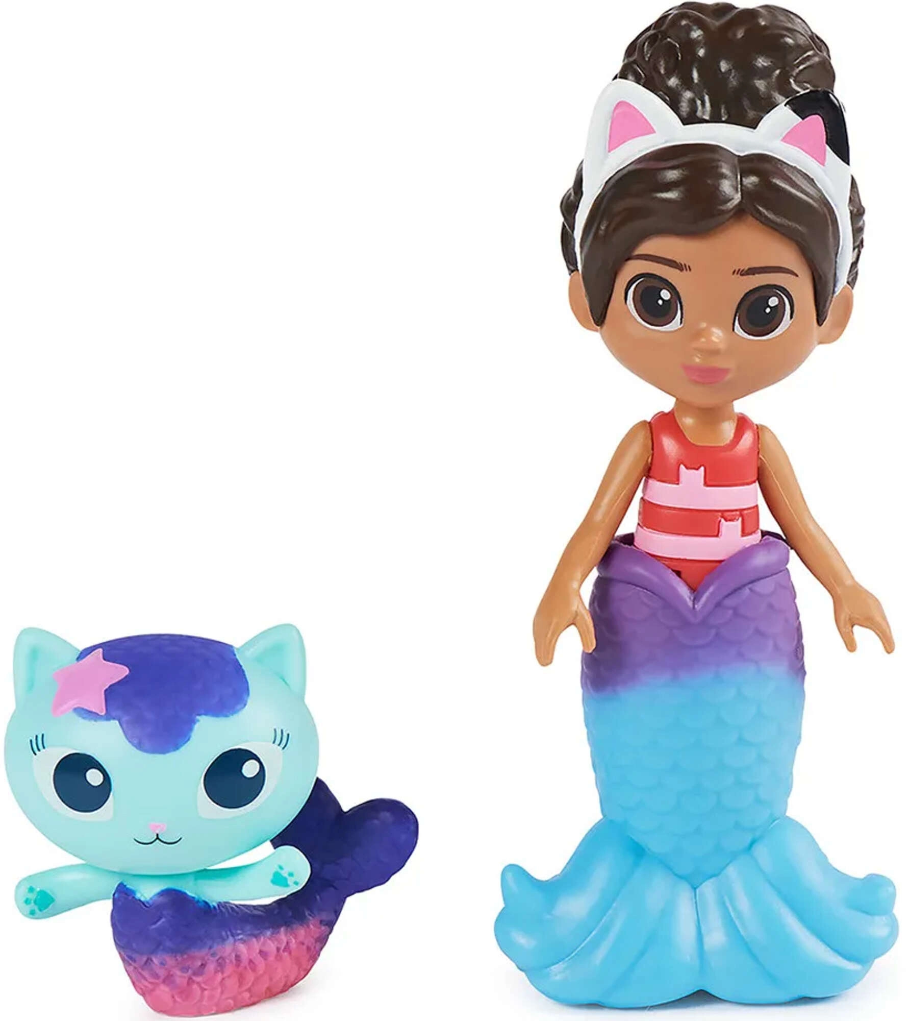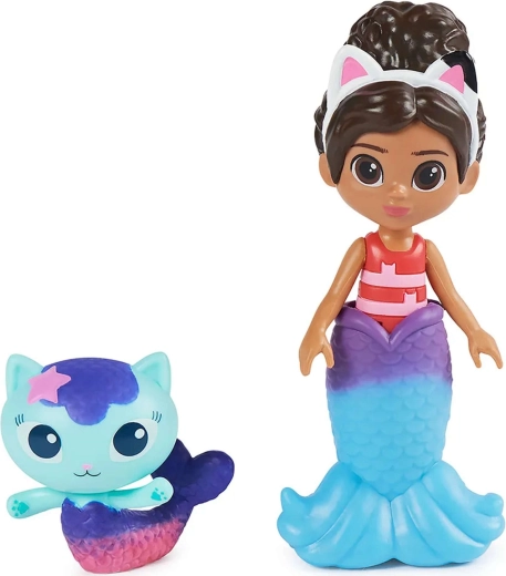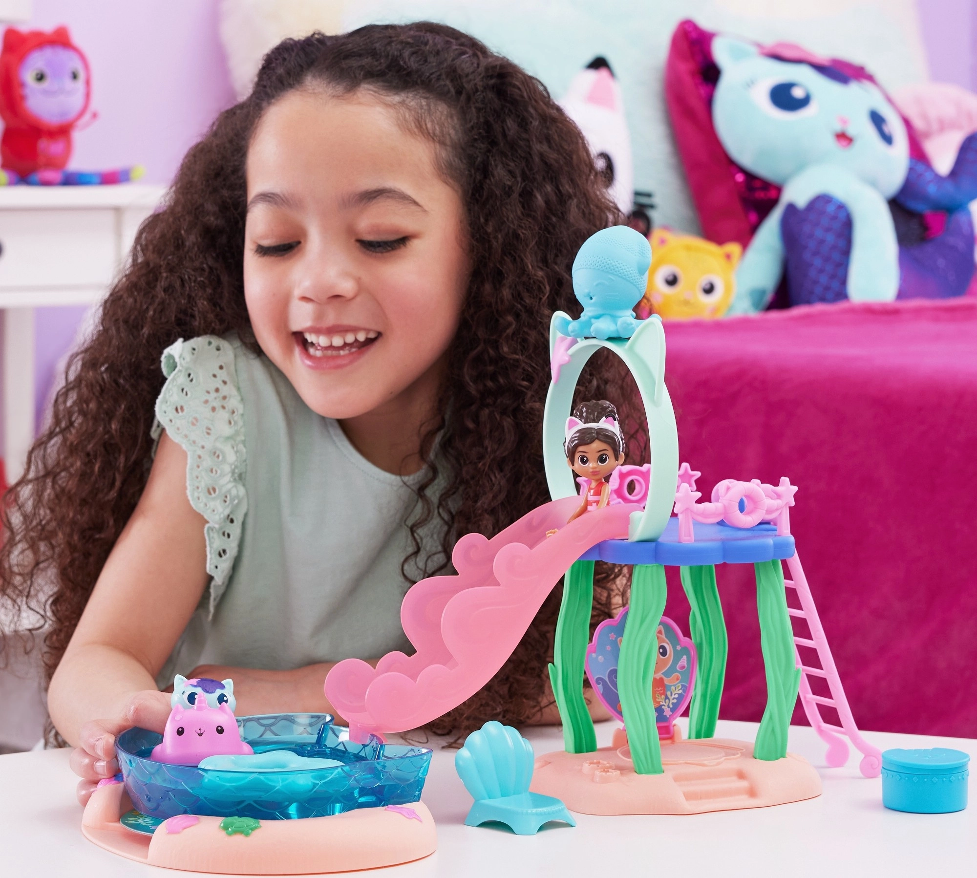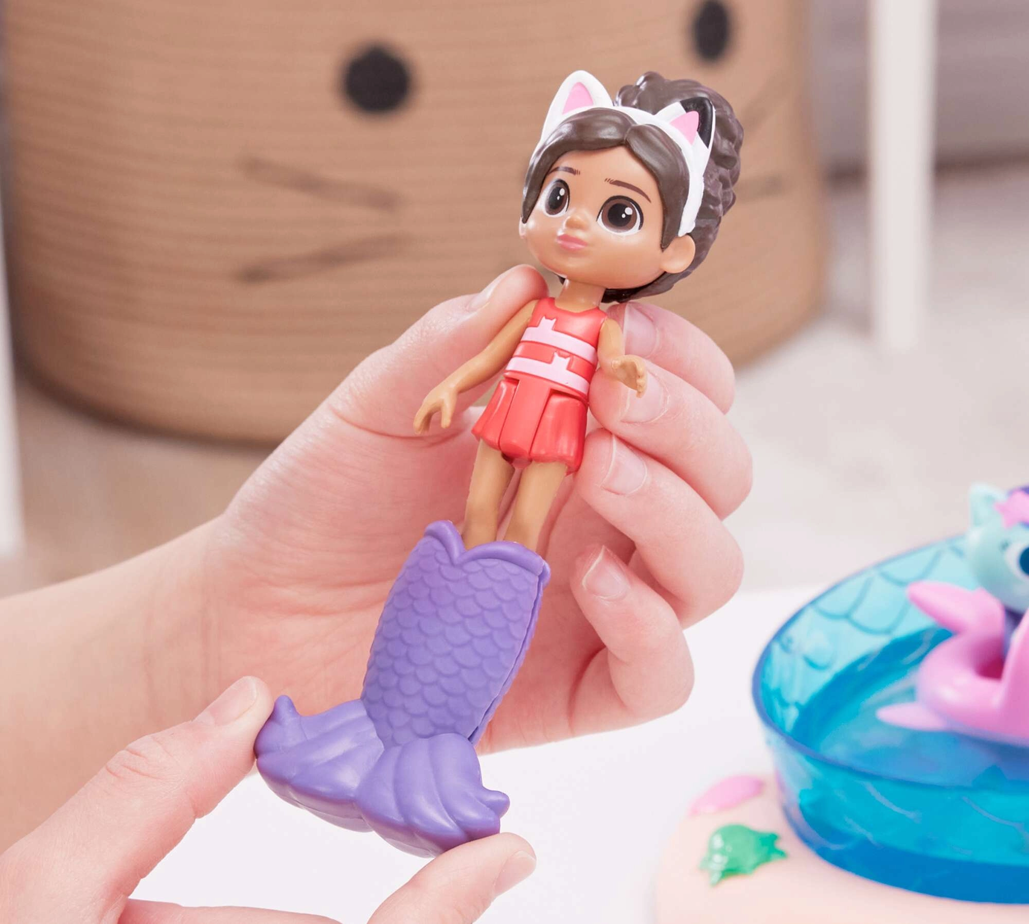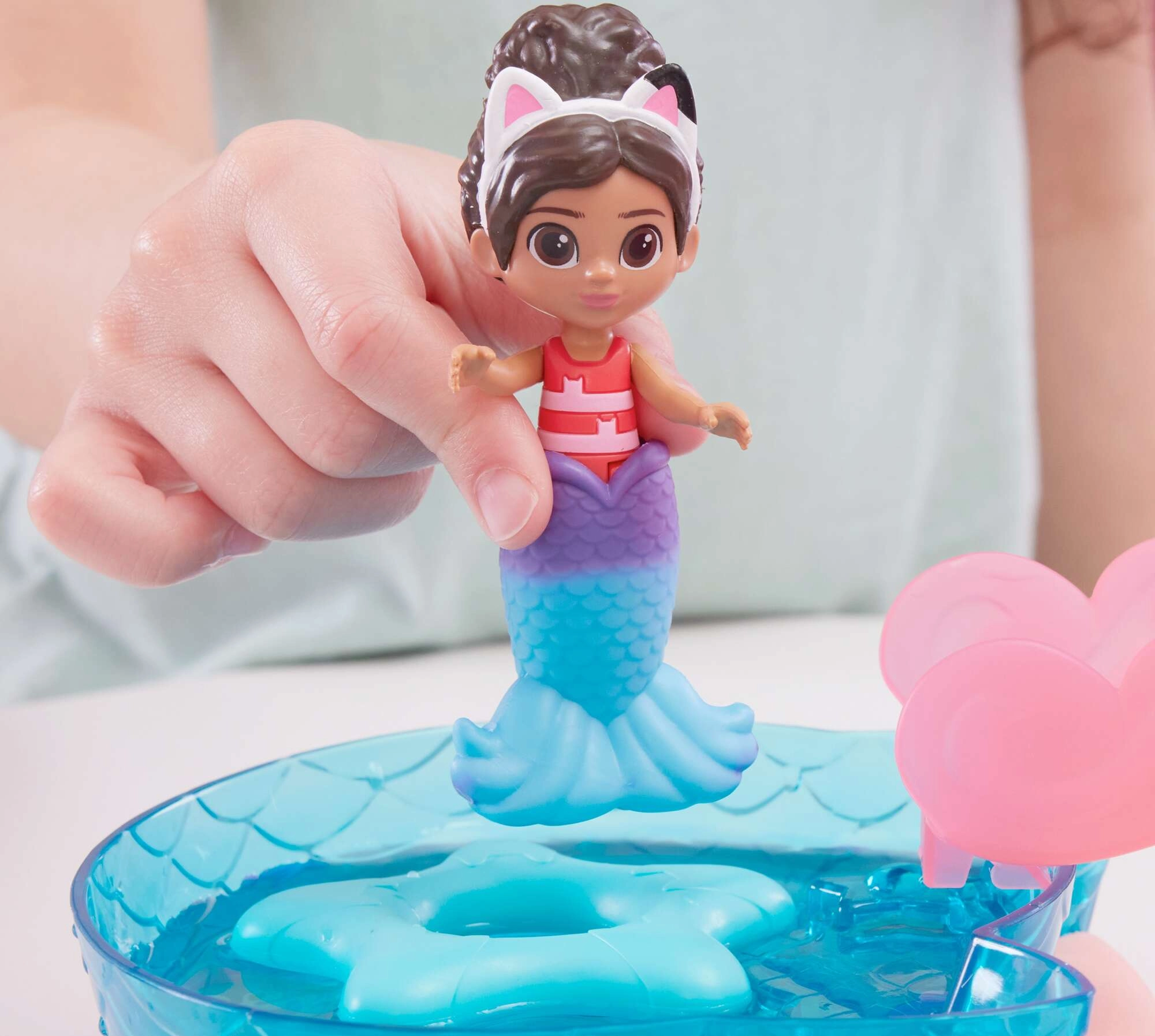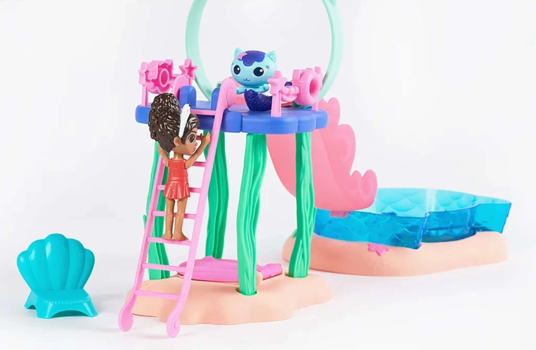Wejdź do świata Kociego domku z świetnym zestawem basenowym, w którym Gabi i Syrenkotka zjeżdżają różową zjeżdżalnią prosto do niebieskiego basenu. Za pomocą spryskiwacza w kształcie ośmiorniczki aktywuj magiczną zmianę koloru na ich płetwach ogonowych i odkryj ukrytą niespodziankę w wielkiej muszli pod zjeżdżalnią.