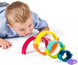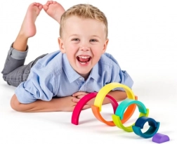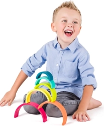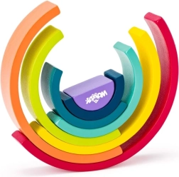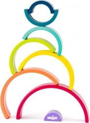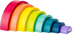 Drewniane kostki w kształcie tęczy zachęcają dzieci do twórczości i wyobraźni podczas układania różnych kształtów.
