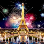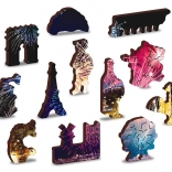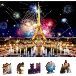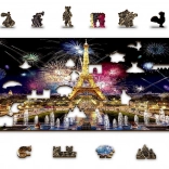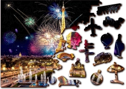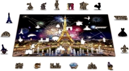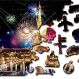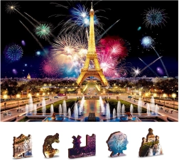 Puzzle są dwustronne (2w1): z jednej strony układasz kolorowy motyw nocnego Paryża z fajerwerkami, z drugiej – powtarzający się wzór wyłącznie według kształtów elementów. Gładkie krawędzie bez drzazg zapewnia precyzyjna obróbka laserowa oraz solidna płyta HDF o grubości 3–4 mm. W zestawie znajdziesz także osobny wzór-podkładkę dla wygodniejszego układania.