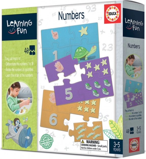 Odkryj zabawną drogę do matematyki z serią EDUCA Learning is Fun. Ten zestaw wprowadza dzieci w liczby 1–10, uczy pierwszego liczenia i łączy cyfrę, liczbę obrazków oraz palce. Każdej liczbie odpowiadają 4 elementy puzzli, które rozwijają małą motorykę, myślenie logiczne i cierpliwość. Dodatkowo produkt jest w 100% poddawalny recyklingowi.