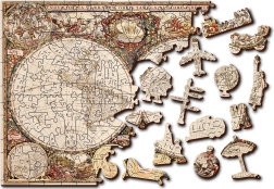 Drewniane puzzle z motywem antycznej mapy ucieszą miłośników oryginalnych układanek i kolekcjonerów nietuzinkowych prezentów. Dzięki dwustronnemu wykonaniu 2w1 możesz układać obraz na awersie lub spróbować ułożyć rewers z powtarzającym się wzorem wyłącznie według kształtów elementów.