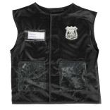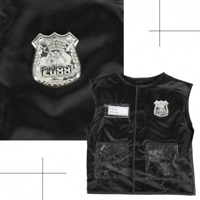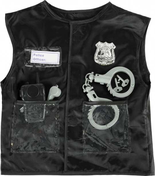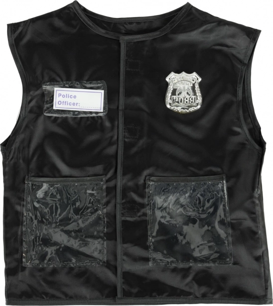 Kamizelka posiada przejrzyste kieszenie, srebrną odznakę oraz naszywkę 'Police Officer', co pozwala dzieciom poczuć się jak prawdziwy policjant.