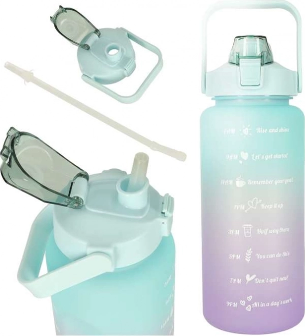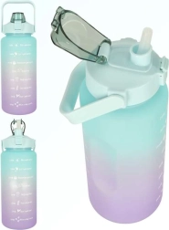 Sportowa butelka na wodę 2 l z praktyczną słomką, szczelną zakrętką i motywacyjną skalą czasową pomoże Ci utrzymać odpowiednie nawodnienie w domu, na siłowni i w podróży. Szeroki otwór ułatwia czyszczenie oraz dodanie lodu lub owoców, a wygodny uchwyt zapewnia łatwe przenoszenie.