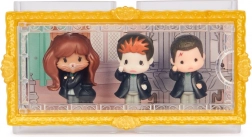 - 3 figurki (Harry Potter, Hermiona Granger, Ron Weasley) + 3 podstawki, transparentne etui z dwustronnym tłem
