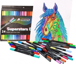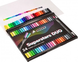 Flamastry dwustronne Next Gen są świetne dla małych i dużych twórców. Połączenie cienkiej, okrągłej oraz ściętej (skośnej) końcówki pozwala przełączać się między rysunkiem detali, konturami a intensywnym wypełnianiem powierzchni jednym obrotem flamastrem. 24 intensywne kolory zapewniają bogatą paletę do projektów szkolnych, domowego tworzenia i kreatywnego relaksu.