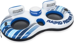 Dmuchana wyspa ma zintegrowane oparcia dla dodatkowego komfortu i przyjemnego odpoczynku na powierzchni wody.