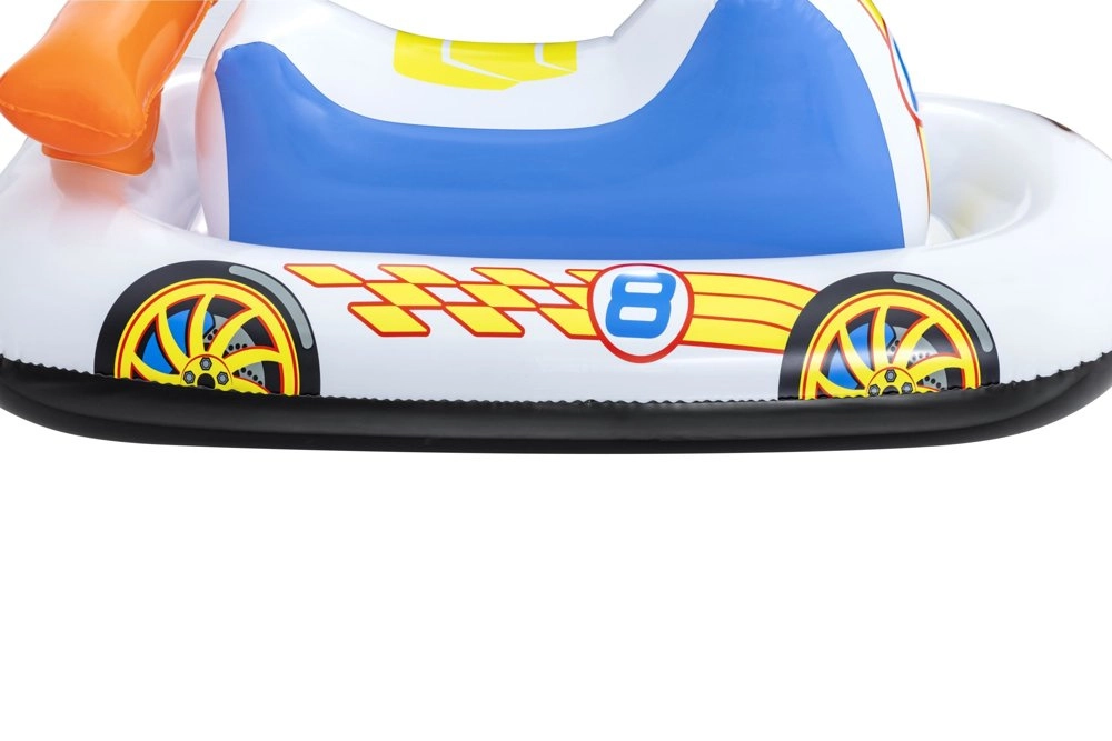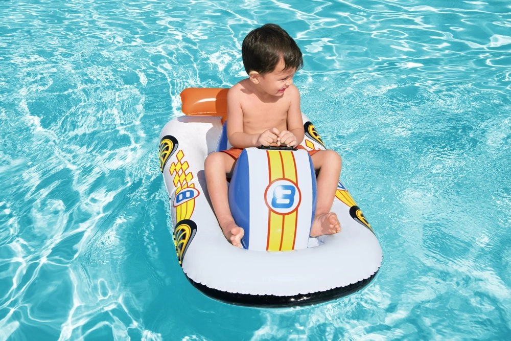 Kolorowa grafika samochodu wyścigowego motywuje dzieci do ruchu w wodzie i zamienia każdy dzień przy basenie w świetną przejażdżkę.