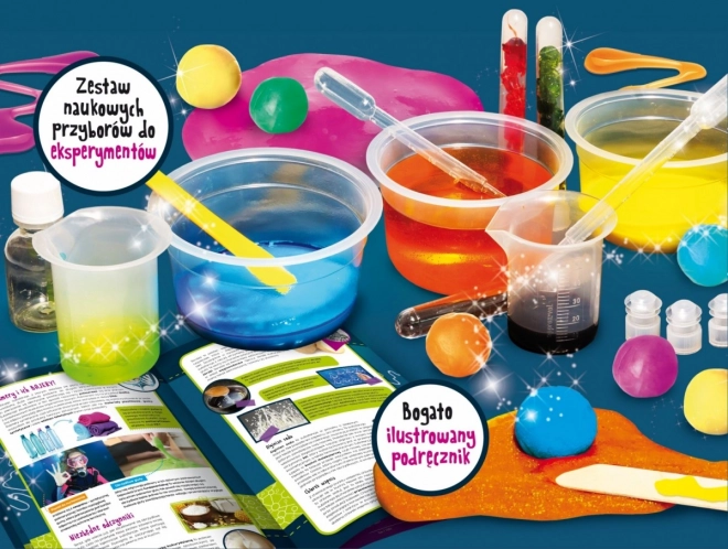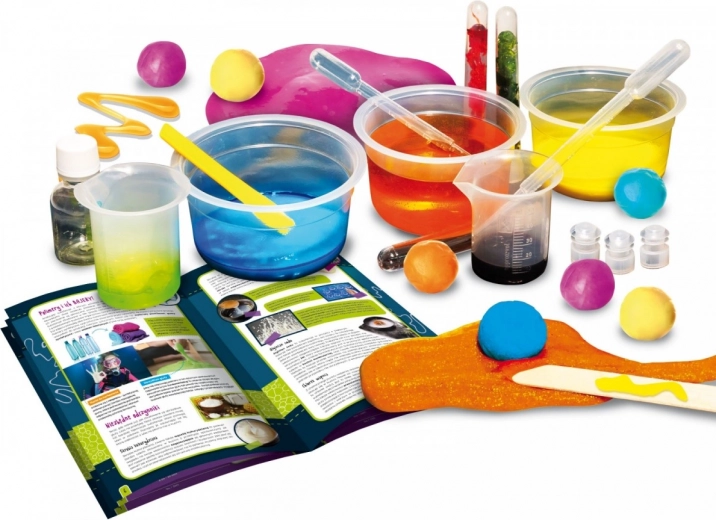 Fascynujący i jednocześnie „brudzący” zestaw konstrukcyjny, dzięki któremu dzieci stworzą z lepkiej masy zabawne i kreatywne rzeczy, w tym skaczące piłeczki, komórki potworków, ruchomy piasek, ciągnące się żelki oraz zabawną plastelinę. Produkt zawiera bezpieczne odczynniki. Uwaga: masy zmieniają kolor i podskakują! Zawartość: okulary ochronne, pipeta, szpatułka, odczynniki, barwniki, miarki, butelka, probówki.