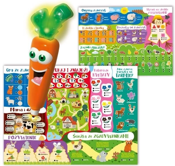 Laboratorium 50 gier z Marchewką to bogaty zestaw przeznaczony dla dzieci w wieku przedszkolnym. Dzieci mają do dyspozycji mówiącą i świecącą Carotinę oraz wiele elementów z grubej tektury, przedstawiających przyjazne zwierzęta i przedmioty ze świata farmy.
