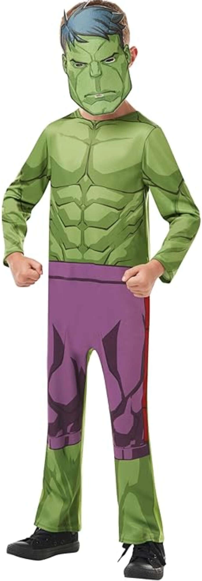 Ten dziecięcy kostium HULK wiernie odwzorowuje wygląd uwielbianego superbohatera – zielone ciało z wyraźną muskulaturą oraz typowe fioletowe „spodnie” są nadrukowane bezpośrednio na miękkim, tkaninowym kombinezonie. W zestawie znajduje się także maska na twarz, która idealnie dopełnia cały look.