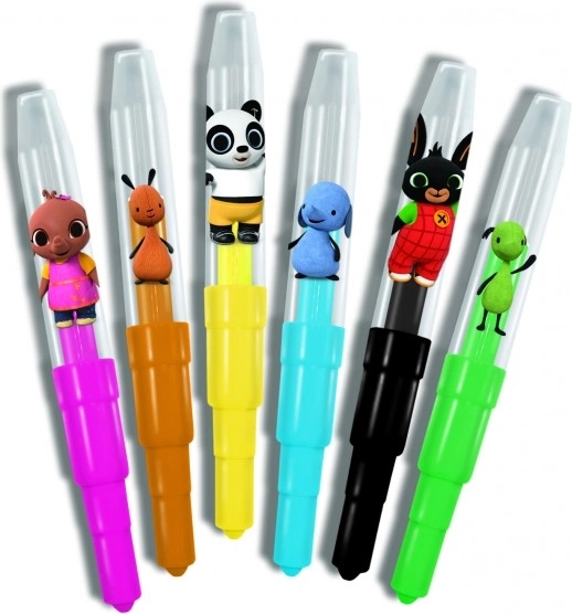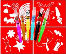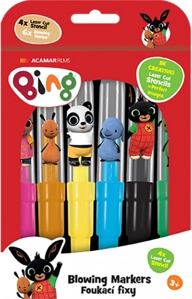 Zestaw pisaków dmuchanych BING ucieszy wszystkich małych artystów. Sześć barwnych kolorów i tematyczne szablony pozwalają łatwo tworzyć oryginalne obrazki z ulubionymi postaciami. Proste dmuchanie przez pisak tworzy delikatne przejścia i efekt sprayu bez bałaganu.