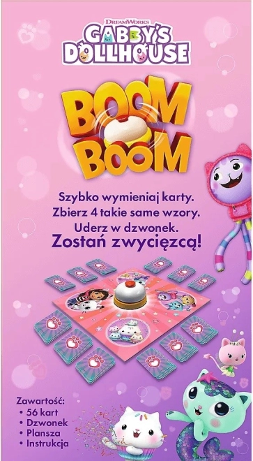 Boom Boom Koci domek Gabi to gra, w której każdy gracz gra jednocześnie, stara się zdobyć 4 takie same karty i wygrać. Gra przynosi wiele emocji i zabawy. Idealna na rodzinne spotkania lub zabawę z przyjaciółmi.