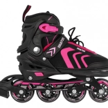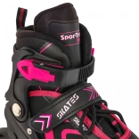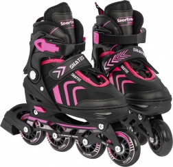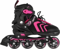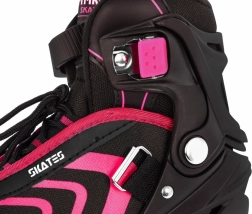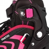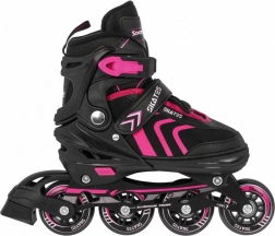Prosta regulacja rozmiaru przyciskiem obejmuje długość stopy 16,5–20 cm, dzięki czemu łyżworolki posłużą przez kilka sezonów.