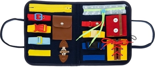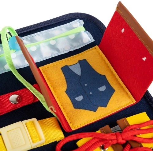 Zawiera 14 różnorodnych elementów, w tym zamki błyskawiczne, klamry, guziki i inne, które wspierają praktyczne umiejętności i samodzielność.