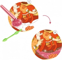 - Zawartość opakowania: 4 ilustrowane karty (20 x 20 cm), 6 tub z brokatem, 1 pędzel, 1 plastikowe narzędzie oraz kolorowa broszurka z instrukcjami krok po kroku.