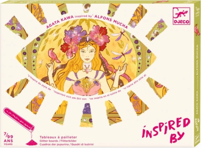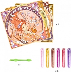 Przedstawiamy świecący malunek z ilustracjami inspirowanymi stylem Alfonse'a Muchy. Dzieci umieszczają obrazek w pudełku, odkrywają wcześniej naklejone miejsca za pomocą dostarczonego narzędzia i posypują brokatem zgodnie z kolorowymi instrukcjami.