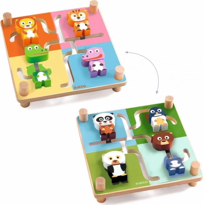 Ułóż zwierzątka z dwóch części w przesuwnym labiryncie. Gdy 4 zwierzątka zostaną ułożone, labirynt odwraca się i na drugiej stronie można ułożyć kolejne 4 zwierzątka.