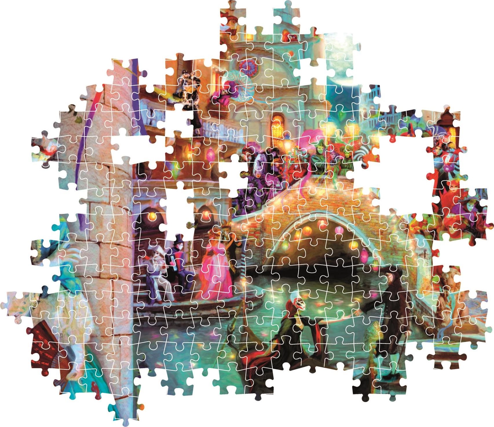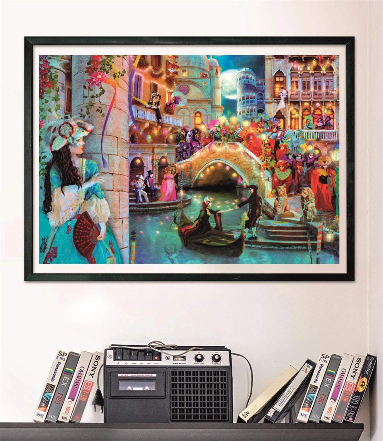 Elegancka ilustracja księżycowej weneckiej nocy pełnej masek, świateł i gondoli wciąga w klimat każdego miłośnika puzzli. Dzięki najwyższej jakości druku i wytrzymałemu kartonowi z kolekcji High Quality poszczególne elementy łączą się pewnie, a obraz wyróżnia się wysoką ostrością i kontrastem.