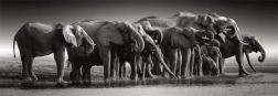Imponująca czarno-biała fotografia słoni przy wodzie nadaje gotowemu obrazowi ponadczasowy charakter i doskonale wkomponuje się we współczesne wnętrza.