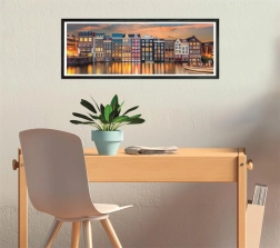 Urokliwa wieczorna scena kamienic nad kanałem z odbiciami w wodzie nadaje gotowym puzzlom wyjątkową atmosferę i nowoczesny charakter dekoracyjny.