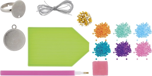 - 8 kolorów kryształków, aplikator, organizer, łańcuszek, szablon pierścionka, szablon zawieszki, 1 arkusz naklejek na pierścionek, 1 arkusz naklejek na zawieszkę