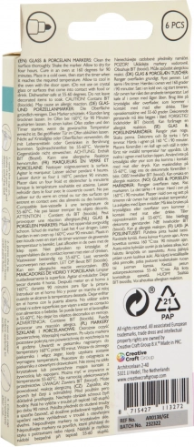 Marker do porcelany i szkła – za pomocą tego markera możesz malować na porcelanie i szkle. Kolory są wodoodporne. Można myć w zmywarce. Instrukcja na opakowaniu produktu.