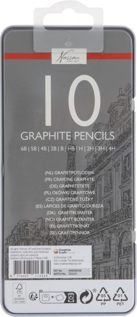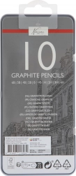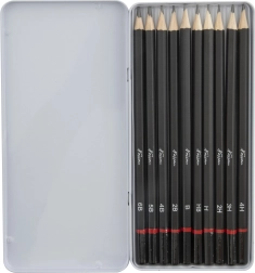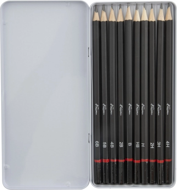 Zestaw 10 ołówków grafitowych obejmuje pełen zakres do twórczej pracy: od miękkich do głębokich cieni i ekspresyjnych pociągnięć po twarde do subtelnych detali i technicznych linii. Dołączone metalowe etui chroni ołówki podczas przenoszenia i utrzymuje porządek w pracowni oraz w szkole.