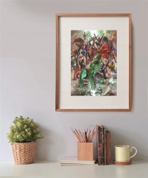 Kolorowa scena z superbohaterami wyróżnia się dzięki wysokiej jakości nadrukowi i solidnej tekturze.
