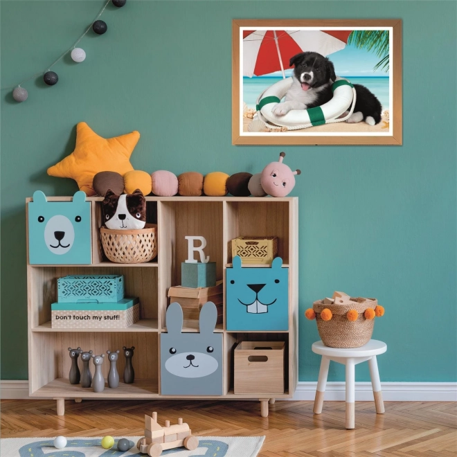 Uroczy szczeniak na kole ratunkowym wprowadza wakacyjny nastrój i ucieszy małych miłośników zwierząt.
