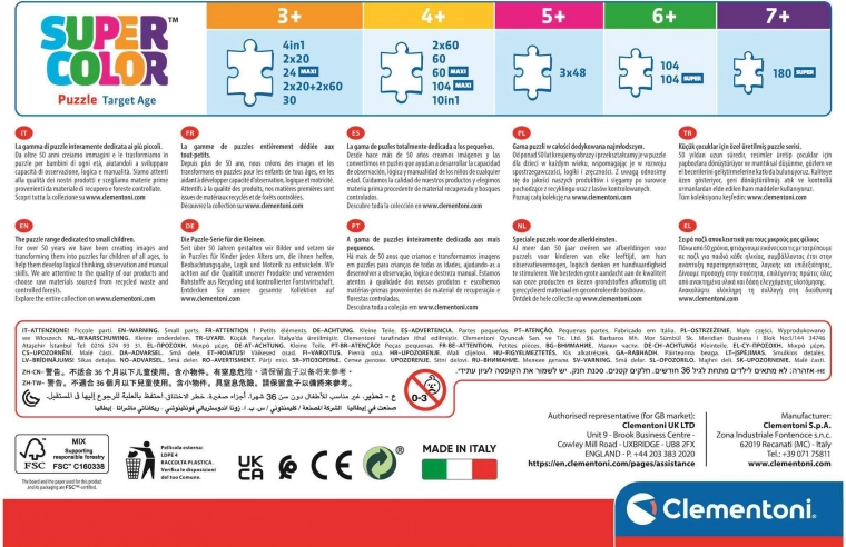 Puzzle Clementoni z ulubionymi bohaterami z Psi Patrol ucieszą wszystkich małych konstruktorów. Dzięki technologii Super Color wyróżniają się intensywnymi kolorami i ostryą grafiką, a starannie wycinane elementy zapewniają idealne dopasowanie bez strzępienia. Opakowanie zawiera dokładnie 104 elementy i umieszczone jest w trwałym, eleganckim pudełku.