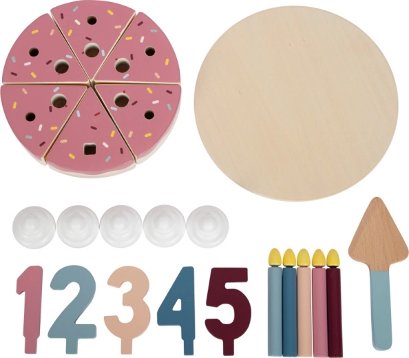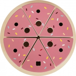Drewniany tort urodzinowy do krojenia small foot Tasty zamieni pokój dziecięcy w radosne przyjęcie. Sześć realistycznych kawałków z różowym „kremem” i posypką łączy się za pomocą rzepów w cały tort, który dzieci łatwo „pokroją” dołączoną łopatką. Wyjmowane świeczki, kawałki kremu i cyfry 1–5 zachęcają do fantazyjnego dekorowania oraz nauki liczb i kolorów.