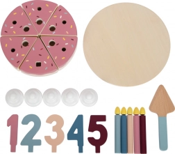 Wyjmowane świeczki, kawałki kremu i cyfry pozwalają dzieciom tworzyć własne urodzinowe kompozycje i uczyć się kolorów oraz liczb w formie zabawy.