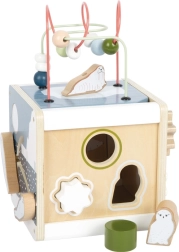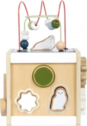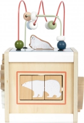 Podaruj dzieciom nieskończoną zabawę i naukę z drewnianą kostką motoryczną SMALL FOOT ARCTIC z 100% drewna FSC. Na pięciu stronach znajdziesz koralikowe labirynty, sorter kształtów, przesuwne labirynty, kółka zębate oraz obrotowe elementy, które wspierają małą motorykę, logikę i rozpoznawanie kolorów i kształtów. Zdejmowana pokrywka ułatwia przechowywanie elementów, a zaokrąglone krawędzie zapewniają bezpieczną zabawę. Nowoczesny arktyczny design doskonale wpasuje się w pokój dziecięcy.