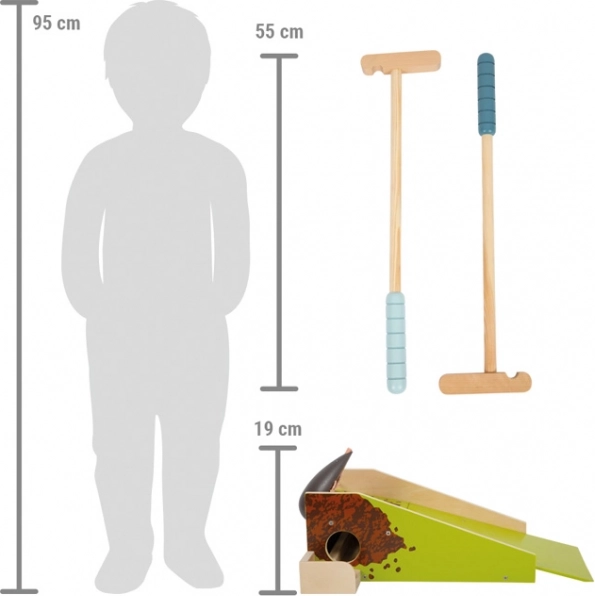 Odkryj urok minigolfa w dziecięcym wydaniu. Stabilny drewniany tor z zabawnym „kopcem kreta” i mechanizmem chwytającym reaguje na każdy celny putt – piłka przejeżdża przez tunel, a krecik wystawia główkę. Dzięki kompaktowym wymiarom gra jest idealna do pokoju dziecięcego, salonu i ogrodu.