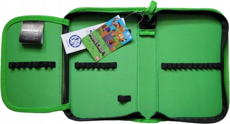 Jednopoziomowy szkolny piórnik z jedną klapką z motywem Minecraft.