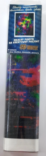 Opakowanie zawiera: płótno z nadrukowanym obrazem, długopis do aplikacji kamyczków, tackę do wysypywania kamyczków, wosk do przyklejania, zestaw kolorowych kamyczków.
