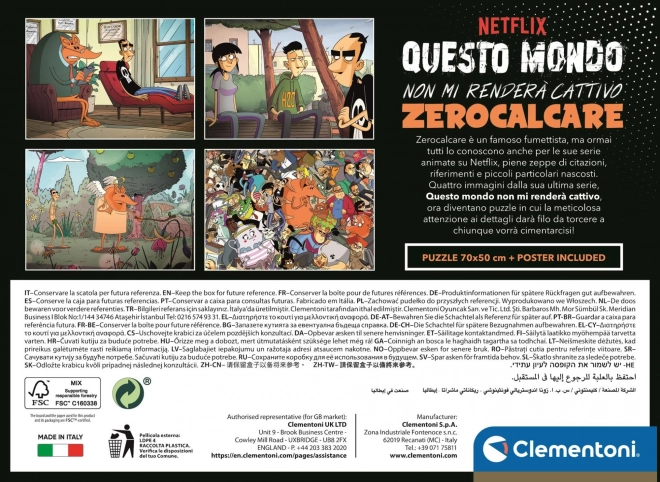 Odkryj fascynujący świat włoskiego twórcy Zerocalcare dzięki licencjonowanym puzzlom CLEMENTONI. Precyzyjnie wycinane elementy łatwo do siebie pasują i tworzą gładki końcowy obraz z wyrazistymi kolorami, który zachwyci fanów komiksu i serialu Netflix.