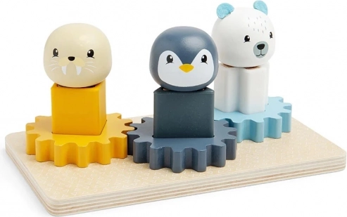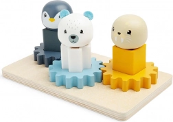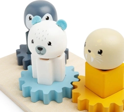 Zawiera pingwina, morsa i niedźwiedzia polarnego, które dzieci mogą umieszczać na różnokolorowych podstawkach i obracać nimi.