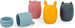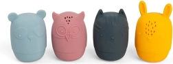 Cztery urocze zwierzątka, w tym panda, królik, kot i sowa, wnoszą zabawę do każdej kąpieli.
