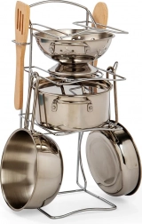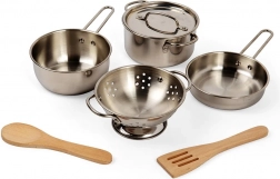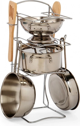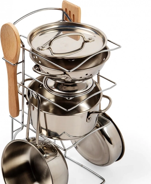 Z tym 8-częściowym zestawem dzieci zyskują szansę i narzędzia do zabawowego gotowania. Zawiera realistycznie wyglądające metalowe naczynia, takie jak cedzak, patelnia, dwa garnki z pokrywkami oraz drewnianą łyżkę i szpatułkę na praktycznym stojaku. Idealne do wspierania kreatywności, rozwoju mowy i umiejętności społecznych.