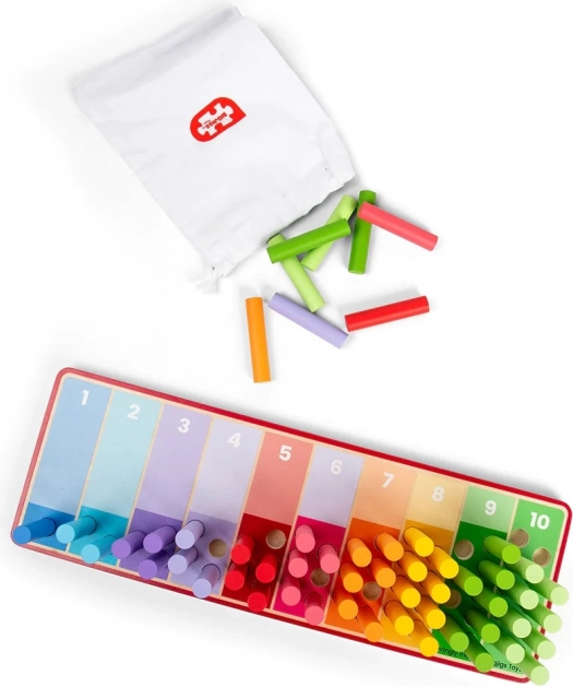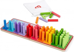 Tęczowe patyczki do liczenia są idealnym wyborem dla dzieci od 18 miesiąca życia, które chcą nauczyć się liczyć i rozpoznawać kolory. Zabawka zawiera drewnianą planszę z kolorowymi sekcjami oraz 55 barwnych patyczków do wkładania w te sekcje. Wszystkie części tego produktu zostały wykonane z certyfikowanego FSC® drewna, dzięki czemu są nie tylko bezpieczne dla dzieci, ale także przyjazne dla środowiska.