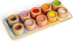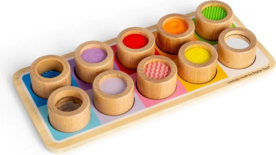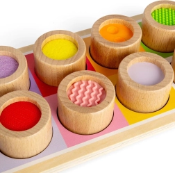 Ta wyjątkowa płyta sensoryczna jest doskonałym sposobem, aby przedstawić dzieciom różne tekstury i kolory. Zawiera drewnianą płytę z kolorowymi otworami i jedenaście elementów do wkładania, z których każdy ma unikalne wykończenie, od żebrowanego silikonu po miękką filcę. Ta zabawka nie tylko pomaga odróżniać różne tekstury, ale także wspiera koordynację ręka-oko.