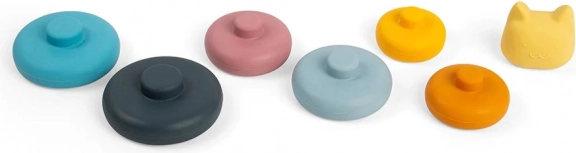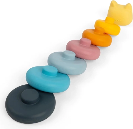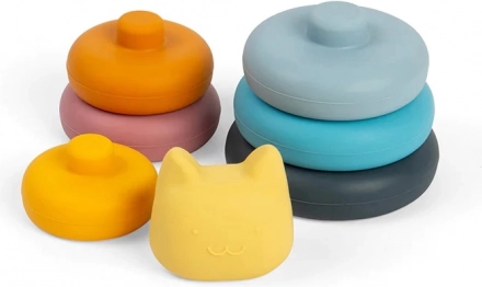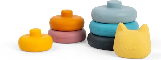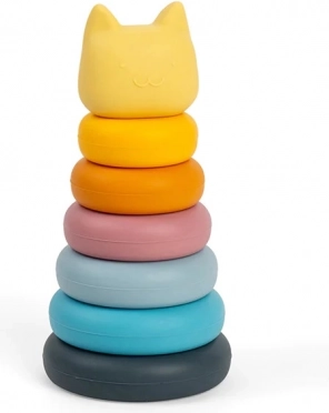 Zabawka składa się z sześciu delikatnie kolorowych pierścieni i kociej głowy na górze. Gładki silikon jest przyjemny w dotyku i jednocześnie wspiera rozwój sensoryczny dzieci. Zabawki do układania pomagają rozwijać umiejętności manualne i naukę kolorów.