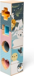 Arktyczna wieża pomaga rozwijać umiejętności poznawcze dzięki drewnianym i silikonowym elementom zaprojektowanym z motywem arktycznych zwierząt.