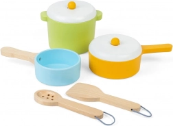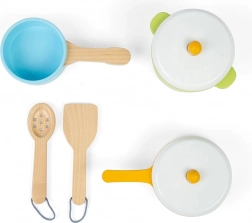 Zawiera 3 garnki, 2 pokrywki i 2 przybory kuchenne, wszystko w pastelowych kolorach, które doskonale imitują prawdziwe naczynia.
